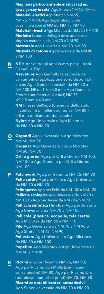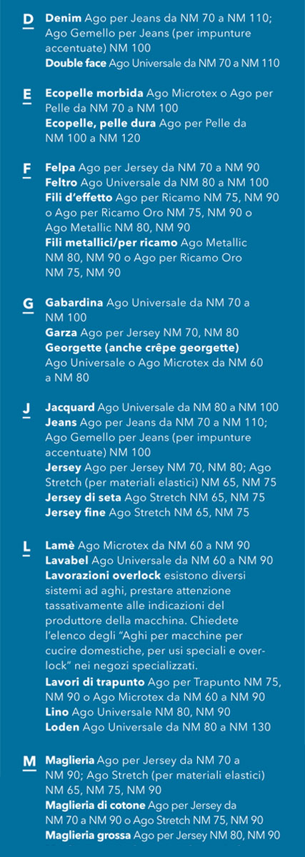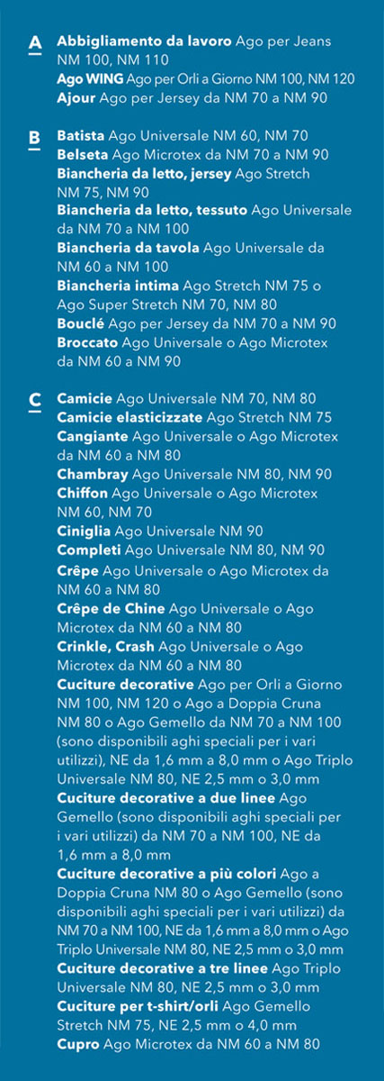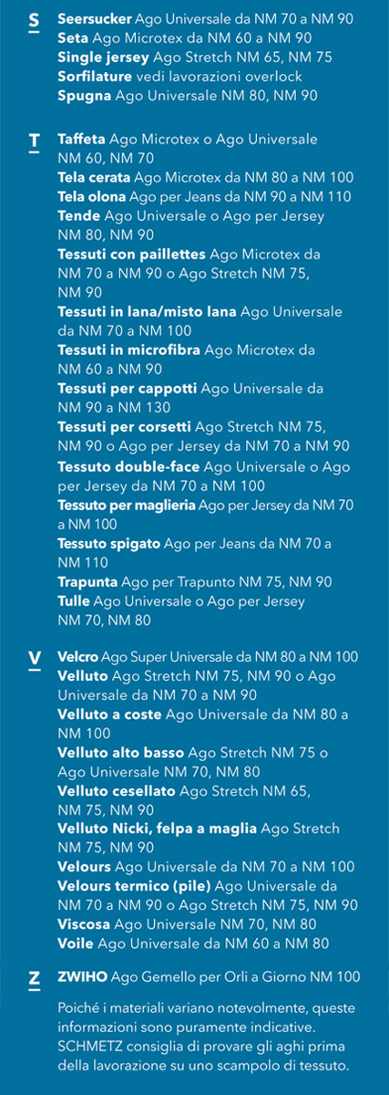 Ecco una lista dei tessuti più utilizzati e il relativo ago SCHMETZ consigliato.